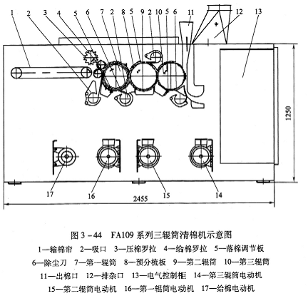 2.FA109系列三辊筒清棉机的主要结构本机主要由机架、给棉系统、清棉系统、排杂系统和电气控制系统组成,主要结构见图3—44。