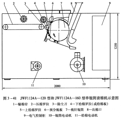 JWF1124系列单辊筒清棉机又可分为JWF1124和JWF1124A两个系列,每个系列均有1200mm和1600mm两种机幅,故有JWF1124—120型、JWF1124—160型、JWFl24A一120型和JWF1124A一160型。其中,JWPll24—120型和JWF1124—160型单辊筒清棉机一般在纺长绒棉的流程中作主清棉机用。JWF1124A一120