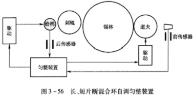 (4)配备长短片段混合环自调匀整装置(图3—56),安装调试方便,检测精度高,生条质量稳定可靠。一般情况下,生条5m重量内不匀率H<1.2%;生条5m重量外不匀率H<2.0%;生条乌斯特条干变异系数CV值在3.5%左右(其他机型与之相同)。