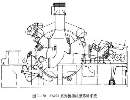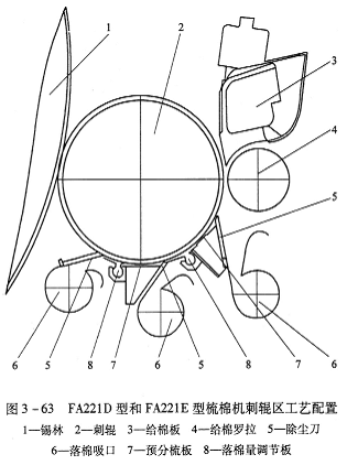 FA221D型和FA221E型梳棉机的刺辊下装有两块落棉量调节板、三把除尘刀、两块预分梳板、一块光滑的三角罩板以及三只吸口(图3—63)。通过调节机构,可调节各机件与刺辊隔距以及后车肚落杂量。
