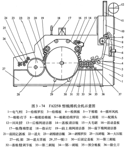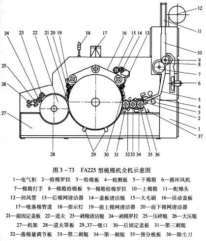 FA225系列梳棉机主要由喂棉箱、机架、给棉部分、刺辊部分、锡林部分、道夫部分、剥棉成条部分、活动盖板部分、吸落棉部分、传动部分、气动部分、电气部分等组成(FA225型梳棉机结构图见图3—73;FA225B型梳棉机结构图见图3—74)。