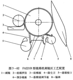 FA221B型梳棉机的刺辊下装有一块落棉量调节板、两把除尘刀、一块预分梳板、一块光滑的三角罩板以及两只吸口(图3—62)。通过调节机构,可调节各机件与刺辊隔距以及后车肚落杂量。