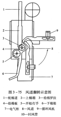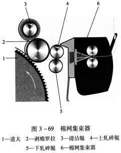 (6)采用倾斜式三罗拉剥棉机构,剥取转移效果好;采用新型气动操纵翻转式棉网集束器,结构简单,消除了高速条件下气流对棉网的影响,适于高产。根据用户需要和原料情况(如纺