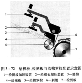 (2)梳棉机的给棉罗拉也采用顺向喂棉方式,利于握持转移纤维,减少纤维损伤。在给棉罗拉的上方设有可调式给棉板和由十块钢板组成的检测板,检测棉层变化更精确,给棉板和检测板与给棉罗拉的隔距可单独调整,加压力也可单独调整(图3—72)。梳棉机的给棉罗拉处设有金属误人防轧自停装置,减少事故的发生(JWF1202型梳棉机与之相同)。