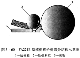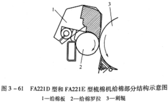 FA221D型和FA221E型梳棉机采用顺向给棉,给棉板安装在给棉罗拉上方,棉箱喂入的棉层通过给棉罗拉上方喂入并由给棉板向下加压。给棉罗拉与刺辊的隔距、给棉罗拉与给棉板的初始隔距、给棉板加压力以及分梳长度均可调节(图3—61)。