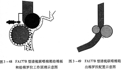 (3)FA177B型的给棉板弹性加压,给棉罗拉顺向喂棉(图3—48),提高转移率,减少纤维损伤,降低短绒率。FA177B型的出棉罗拉采用前小后大配置(图3—49),避免棉层拱起和出现意外牵伸现象,进一步提高喂入梳棉机筵棉的质量。