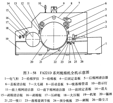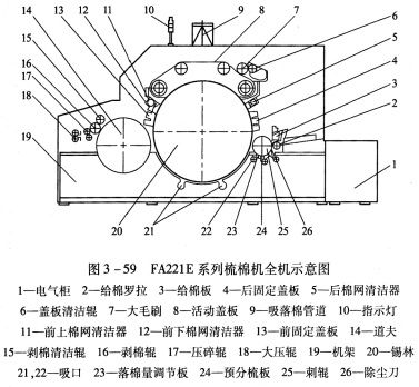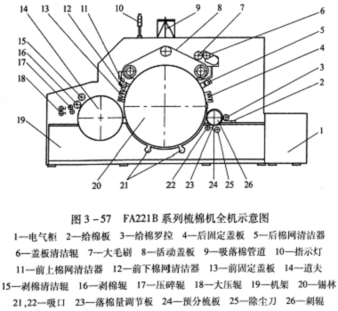 FA221系列梳棉机主要由机架、给棉部分、刺辊部分、锡林部分、道夫部分、剥棉成条部分、活动盖板部分、吸落棉部分、传动部分、气动部分、电气部分等组成,FA221B型、FA221D型和FA221E型的主要结构及配置分别见图3—57—图3—59所示。