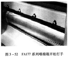 (2)FA177系列清梳联喂棉箱的打手形式为四排螺旋角钉,开松细致柔和,对纤维损伤小。纺长绒棉或化学纤维时,可根据情况加装打手清洁毛刷。