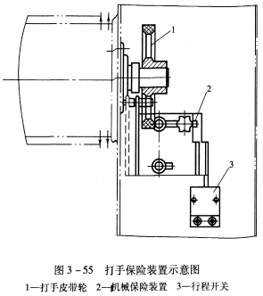 (7)打手保险装置:须将打手保险装置的保险销拉出,并插入打手皮带轮内,方能打开观察窗及扦手罗拉护板,进行机内清洁。同时通过所安装的行程开关作用,保证机械复位前不能开车,确保操作者安全(图3—55)。