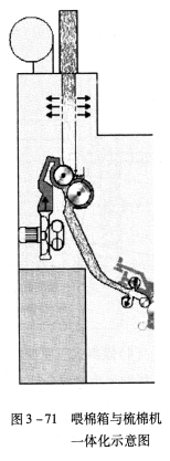 (1)喂棉箱与梳棉机一体化设计(图3—71),达到喂棉与梳理的完美结合。棉箱部分的下棉箱取消了传统的出棉罗拉,直接与梳棉机的给棉罗拉连接,消除了棉箱与梳棉机之间的意外牵伸。棉箱循环风机出风口设计独特,有利于喂棉罗拉握持转移,避免罗拉返花。喂棉箱给棉罗拉为浮动可调式,弹性加压,顺向喂棉(JWF1202型梳棉机与之相同)。