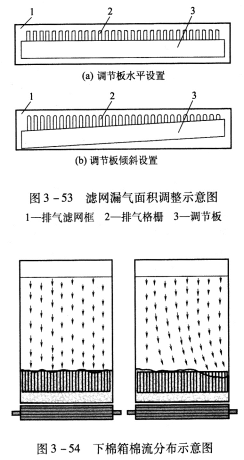 ③棉箱的顶部前后各设有一块排气滤网,该滤网既可水平调节又可倾斜调节,用以调整落棉量及保证落棉横向均匀;中部设有可调节的网眼板,保证上棉箱内原料的密度及充实度;棉箱由上至下逐渐加宽,保证原料顺利下落。