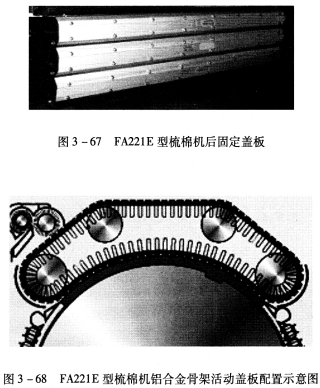 (5)FA225型梳棉机采用高强度球墨铸铁骨架的活动盖板,具有强度高,长期使用不变形,寿命长等优点;FA227B型梳棉机与FA221E型梳棉机相同,采用铝合金型材骨架的活动盖板(图3—68),具有重量轻、安装维护方便等优点。