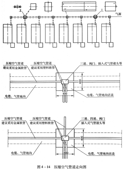 (4)按《压缩空气管道走向图》和《压缩空气连接原理图》预埋压缩空气管道,管道直径最好按照郑州纺织机械股份有限公司所提供图纸的要求进行(图4—14和图4—15中要求压缩空气主管道用内径为20mm的水煤气管或其他种类的无缝钢管)。在每一个用气点用三通进行分气,并安装阀门进行控制。