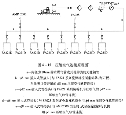 在郑州纺织机械股份有限公司的清梳联流程中,有几种单元机需要使用压缩空气,具体机型有FA022系列多仓混棉机、FA028系列多仓混棉机、TF2212型三通配棉器、AMP2000型金属火星二合一探除器、119A型火星探除器、JWF1051A型异纤微尘分离机、FA221系列梳棉机、FA223系列梳棉机、FA225系列梳棉机、JWFl202型梳棉机、JWFl204型梳棉机及TF2511型、TF2512型、TF2513型、TF2514型、TF2521型圈条器等。为方便用户使用,上述所有机型对压缩空气的压力要求相同,均为0.6—0.8MPa。