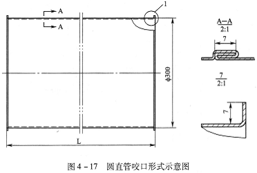 建议采用平咬口(图4—17),圆直管的两端应扳7mm宽的边,以便于用捆圈进行连接。下面以直径为300mm圆直管为例作进一步说明。