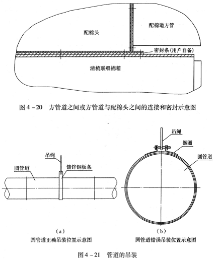在《管道排列图》中有各种圆弯头和圆直管的用量,建议用户在设备到货前半个月左右开始制作,以免耽误工期。各单元机安装完毕后就可以安装输棉及除尘管道,在安装过程中应注意下列问题。