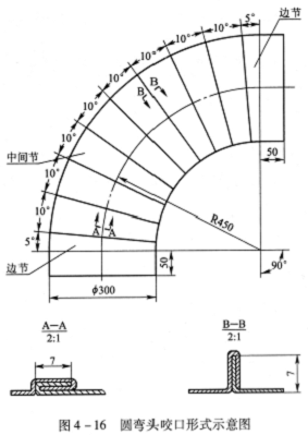 由图4—16可以看出,该弯头的曲率半径为450mm,是弯头直径的1.5倍;中间节单节角度为10°,共8节;边节单节角度为5°,共2节。为便于与其他管道连接,通常在边节的两端增加50mm左右的直管边;单节采用平