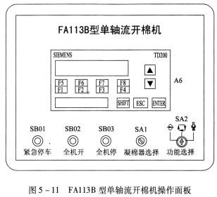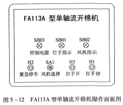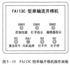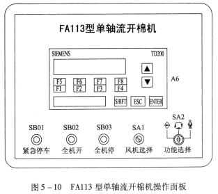 (2)FA113A型和FA113C型为经济型机型,在保证设备的基本性能及开棉机的除杂效果不变的情况下,简化了电气控制系统,采用继电器逻辑控制。这两种机型均附有排尘风机和进棉风机(或凝棉器)的电气控制部分,可通过操作箱上的选择开关SA1(图5—12和图5—13)来控制其开停。启动打手电动机并立即停止,观察打手运行的状况,仔细查看打手转动方向是否正确、有无异响等。若一切正常,单独把打手运行起来,观察打手的运行状况,检查面板上得到的速度值是否与设定值相符。