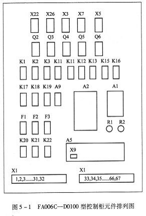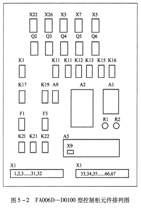 为方便阅读和理解,将FA006C型、FA006C-230型和FA006D-172型、FA006D-230型的控制柜元件排列图摘录于下,FA006C型、FA006C-230型的控制柜元件排列见图5—1,FA006D-172型、FA006D-230型的控制柜元件排列见图5—2。因设备的结构、功能等不断发展,控制柜元件排列图也会有所变化,在安装和调整设备时应以郑州纺织机械股份有限公司提供的技术资料为准(以下相同)。