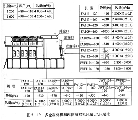 ⑥FA028系列多仓混棉机及FA111系列、FA109系列、FA112系列和JWF1124系列辊筒清棉机出棉口、排尘口、吸落棉口处风量、风压的要求如图5—19所示。