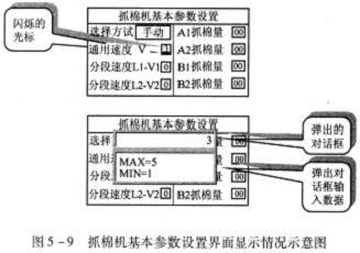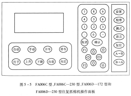 ①设定方式:功能选择开关SA2置于设定方式状态(图5—10和图5—11),按下F1按钮设置A组参数;按下12设置B组参数;按下F3选择单、双组运行工作方式(打手速度设定值设定范围为1~10挡;尘棒角度设定值设定范围1—7挡)。