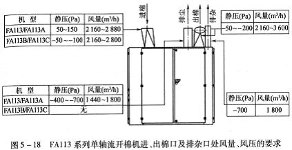 ⑤FA113系列单轴流开棉机进、出棉口及排杂口处风量、风压的要求如图5—18所示。