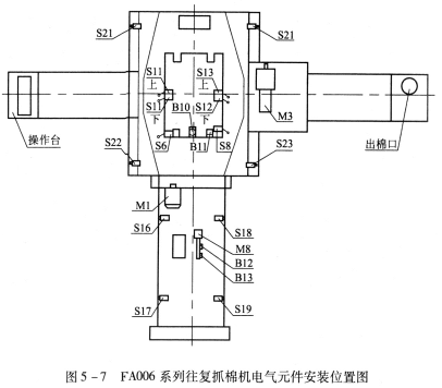 (8)对FA006C型、FA006C-230型、FA006D-172型、FA006D-230型抓棉机还应校准小车,按“校准”键,显示屏显示“小车校准”界面。首先确认为手动方式,按“向后”键』、车向后行驶碰到行程开关S6(图5—7),小车停止并复零。持续按“向前”键,小车向前行驶,当行驶到接近开关B10时校准值将自动进入。