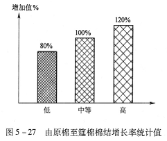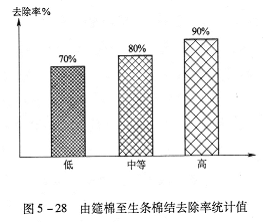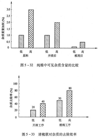 ZellwegerUster公司根据大量的数据统计给出了纺纯棉时配棉、筵棉、生条的杂质含量,纯棉中可见杂质含量的比较见图5—32;清梳联流程开清部分和梳棉工序对杂质的去除效率见图5—33。根据配棉的含杂率,应统筹考虑开清部分、梳棉部分及全流程的落棉率、落棉含杂率和除杂效率。在开清部分,应根据配棉中的杂质性状,合理分配开棉机和清棉机的落棉率和除杂效率。在梳棉部分,也应合理分配刺辊区、盖板区、棉网清洁器等部分的落棉率和除杂效率。