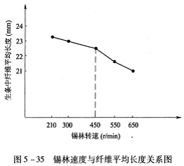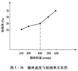 ③提高锡林速度有利于提高分梳效能,但锡林速度过高会造成梳理力过高,导致纤维损伤,使短绒率增加。有资料显示,锡林速度与纤维平均长度和短绒率有一定的关系,锡林速度与纤雏平均长度的关系如图5—35所示,锡林速度与短绒率的关系如图5—36所示。由图中不难看出,当锡林速度超过450r/min以后,纤维平均长度缩短,短绒率增加;故从纤维损伤的角度来看,锡林速度不宜过高。在使用过程中,应根据配棉、生条和成纱的综合质量指标来确定锡林的转速。