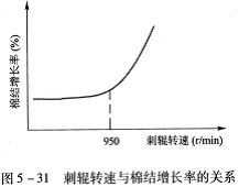 ③选择合适的刺辊转速和刺辊与锡林间的线速比,对降低生条棉结也很有利。关于刺辊速度,有人认为不宜超过950r/min(刺辊直径为φ250mm时),否则会使纤维损伤增加,棉结增加(图5—31)。根据试验分析认为,对于成熟度低、线密度低的纤维,刺辊速度低于950r/min比较适宜;而对于成熟度较好、线密度较高的纤维,则在一定的范围(低于1200r/min)内刺辊速度越高棉结越少,成纱质量也越好。在保证刺辊上的纤维有足够的离心力,使纤维能正常转移到锡林的情况下,适当提高速比可以提高产品的质量,锡林与刺辊的线速比一般应在2.0—2.5,甚至可更大些。