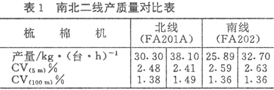 1989年~1991年,由宏大纺机(集团)公司牵头,郑州纺机、青岛纺机等七个单位参加的《清梳连续化工艺与设备的研究》会师在无锡马山纺机试验中心,提供的新设备有FA201A型和FA202型高产梳棉机,配FT022型混合环、YZ-2型长闭环自调匀整器;FA172型和FAl75型无回棉连接系统。用同一套开清棉机,梳棉机分为南北两条线:南线为FA175型棉箱+FA202型梳棉机+YZ-2型匀整器;北线为FA172A型棉箱+FA201A型梳棉机+FT022型匀整器。经三个月生产试验,实际达到的产量与生条质量水平如表1所示。