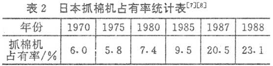 表2是抓棉机在日本推广应用的统计表。从表中可以看到:①1985年以前大约二十年时间,抓棉机推广速度缓慢,到1985年占有率仅达到9.5%。②1987年开始突然加快。