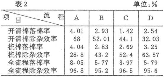 四种流程清梳联生产线都纺精梳纱,用棉条件相近,等级长度在1~1.5级/29ram,甲乙杂在1.26%~1.4%,细度在1.74~1.67dtex,有一定可比性。因此对落棉率和除杂效率作了统一测试,测试方法见参考文献(1),测试结果见表2。