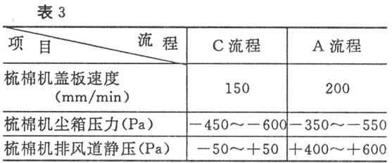 (3)清梳联总落棉率的差异,还与各使用厂的除尘系统设计和工艺参数有关。从同厂制造的A流程和C流程比,二者总落棉率相差达一倍,除了C流程的开清棉开松能力比A流程大大增强以外,还有以下不同(见表3)。