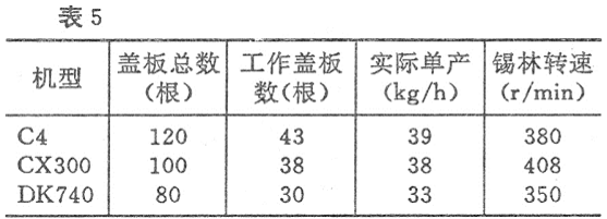从分梳能力强弱看:C4型机分梳区最长,分梳能力最强,实际单产最高,由于开清棉流程开松程度高,所以锡林速度配置为380r/min。CX300型机分梳区居中,分梳能力较强,由于单产开38kg/h,为弥补其开清棉流程开松程度较低,所以锡林速度配置为408r/min。DK740型机分梳区最短,分梳能力较弱,开清棉流程开松程度居中,由于14台梳棉机供应两万锭,实开单产为33kg/h,已够供应,单产较低,所以锡林速度配置为350r/min。