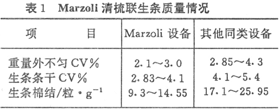 Marzoli清梳联生产稳定,质量优于同类设备,经连续四个月观察测试生条重量外不匀CV%、生条条干CV%及生条棉结质量指标如表1。