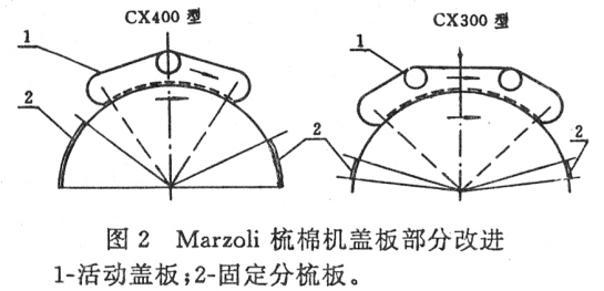 Marzoli梳棉机对锡林前后罩板处,从设计上多增加了若干固定盖板,有利于提高梳棉机对纤维的分梳和平行伸直度。大量去掉纤维中粘附力较强的细小尘杂。实践证明,由于增加了对纤维的预分梳和再分梳的作用,使得整机分梳除杂效果加强,提高了纤维分离度,棉网清晰,生条外观光洁不发毛。