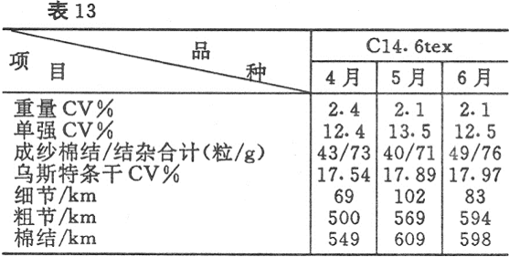 1995年7月份纺C14.6tex纱,其工艺流程如下:清梳联→AZ72F型并条机(头、末道)→FL16型粗纱机→A512型细纱机(牵伸改造为INA牵伸+ME666软胶辊)。成纱质量如表13所示。