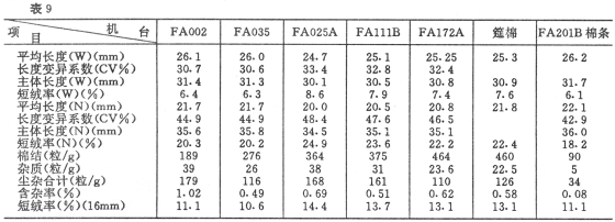 以上棉结、杂质检测,存在各厂目光差异,短绒的手工检测又不够准确科学,为此我们专门取样去北京第三棉纺织厂、遵化棉纺织厂用AFis检测仪器进行检验分析。结果见表9。