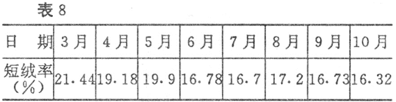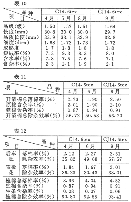 由于高唐棉纺织厂国产清梳联生产线在1995年4月~7月纺制普梳C14.6tex纱,1995年8月开始纺制精梳CJ4.6tex纱,现将普梳、精梳纱的原棉及清梳落棉情况列入表10、表11及表12。