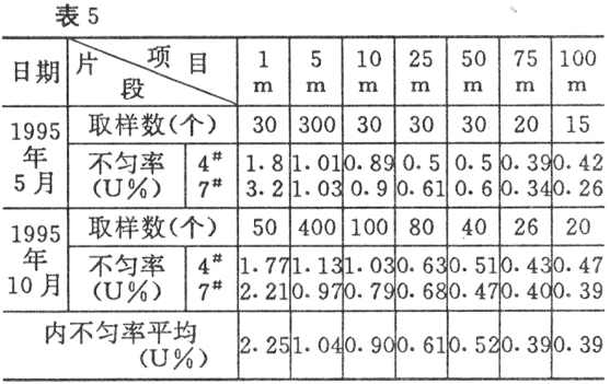 为了了解生条不同片段重量的内不匀,我们分别对U型配棉管道中影响较大的4#、7#梳棉机进行取样测试,结果如表5所示。