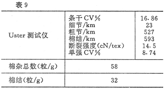 北京第二棉纺织厂纱号品种各项成纱指标均控制在Uster89公报50%水平,表9的各项指标与北京第二棉纺织厂的成纱指标对比均已达到该厂较好的成纱质量水平。