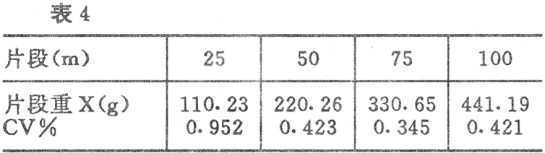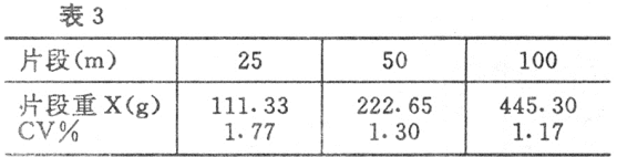 从表3看,整个不同片段总不匀情况较好,尤其是25m片段,其CV%为1.77,已达到攻关项目要求的指标。