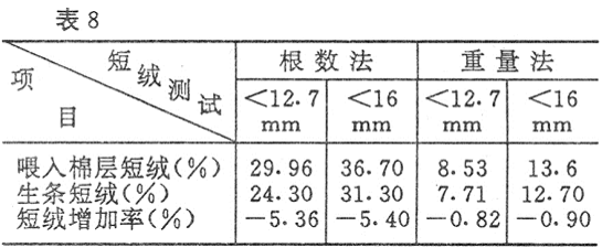 现将各种工艺调整后短绒的试验情况列入表7(<16mm长度手工试验法)、表8(AFis检验仪测试)所示。