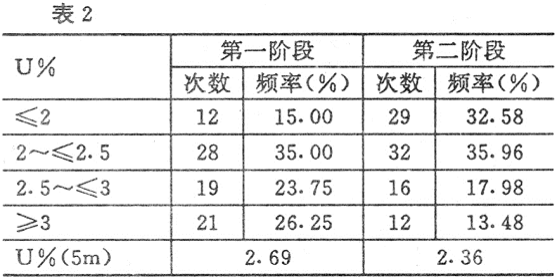 从表2看,本系统较稳定,重不匀情况较好,U%的平均值在第一阶段为2.69,在第二阶段达2.36的较好水平,说明本系统棉箱状态较好。