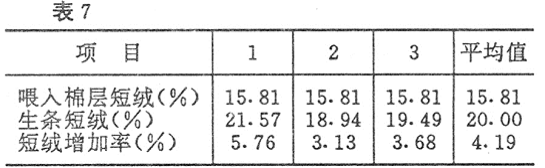 高产梳棉机的生条短绒含量采用国内手工试验方法,都有不同程度的增长。为减少短绒,除梳棉机具有棉网清洁器等措施之外,在工艺配置上对后部工艺、盖板速度等进行试验。通过各种措施的试验,短绒含量及短绒增加量有较明显的降低。