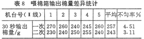 为了控制同一时间内各喂棉箱输出棉量差异,我们在梳棉机速度相同(即单产一致)情况下,同时停止梳棉机运转,即可测得30s各喂棉箱输出棉量,其差异分析可表明下棉箱储棉量和气压波动情况。试验结果见表8。