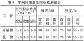 我厂老车间技术改造前后的环境卫生指标均请国家有关监管部门作了检测。其中清梳车间检测数据见表9。改后车间粉尘浓度、噪声及照度值均全面达到了国家规定标准。滤尘室操作区域空气含尘浓度都小于3mg/m3,最少的为1mg/m3。