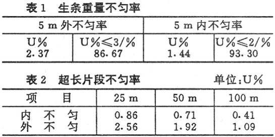 由于清梳联流程中前后连续使用了三级匀整装置,生条重量外不匀率(U%)基本上稳定.在3%以内,内不匀率稳定在2%以内。具体测试指标见表1、表2。