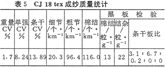 清梳联精梳纺纱系统流程:清梳联合机→PX2型精梳机系统(预并一条并卷准备工艺)→SH802E型并条机(短片段匀整,在线质量检测)→FA423型粗纱机(进口SKF、摇架)→FA506S型细纱机(INA—V型牵伸,气动加压)→Autoconer-238型络筒机。成纱质量见表5。